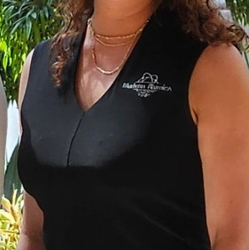 Show off your Modern Atomics pride with this very high-end black woman's v-neck open shoulder, with custom white embroidered Modern Atomics Logo