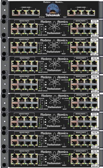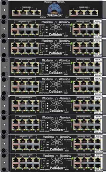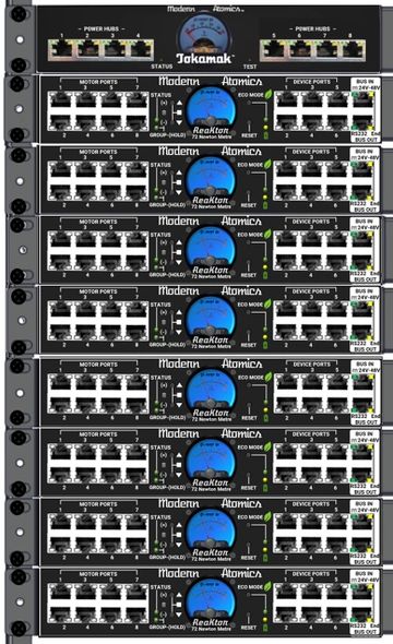 EdgeAI Controlled Plenum-rated 485-hub for up to 192 AC-powered motors and support for up to 14, 485 devices such as keypads or RF receivers, includes ECO MODE GPO connection for power strips and 3rd party control systems and auto programming for User interfaces. Includes (1) Tokamak, & 4 sets of Rack ears/Joiners